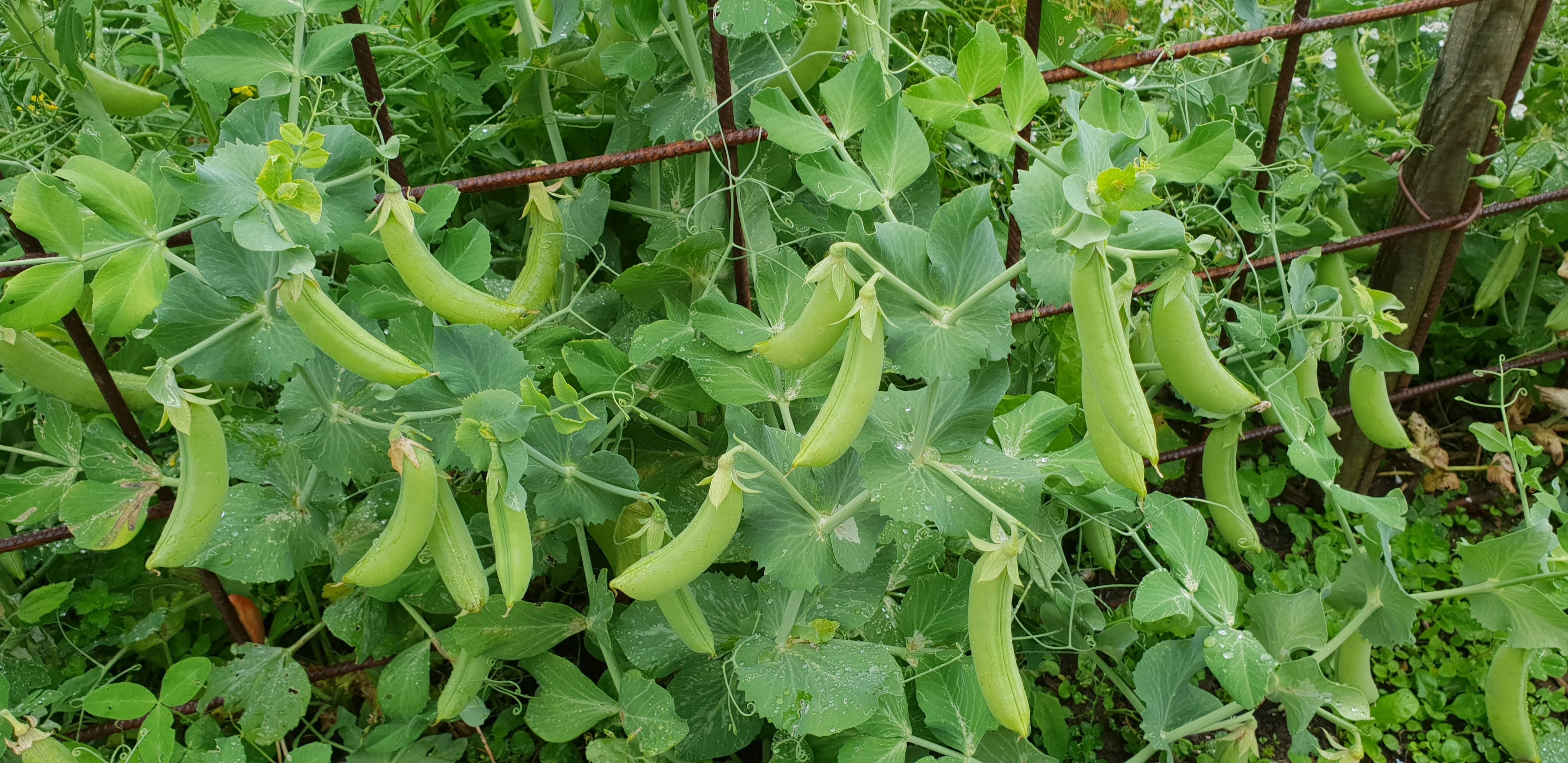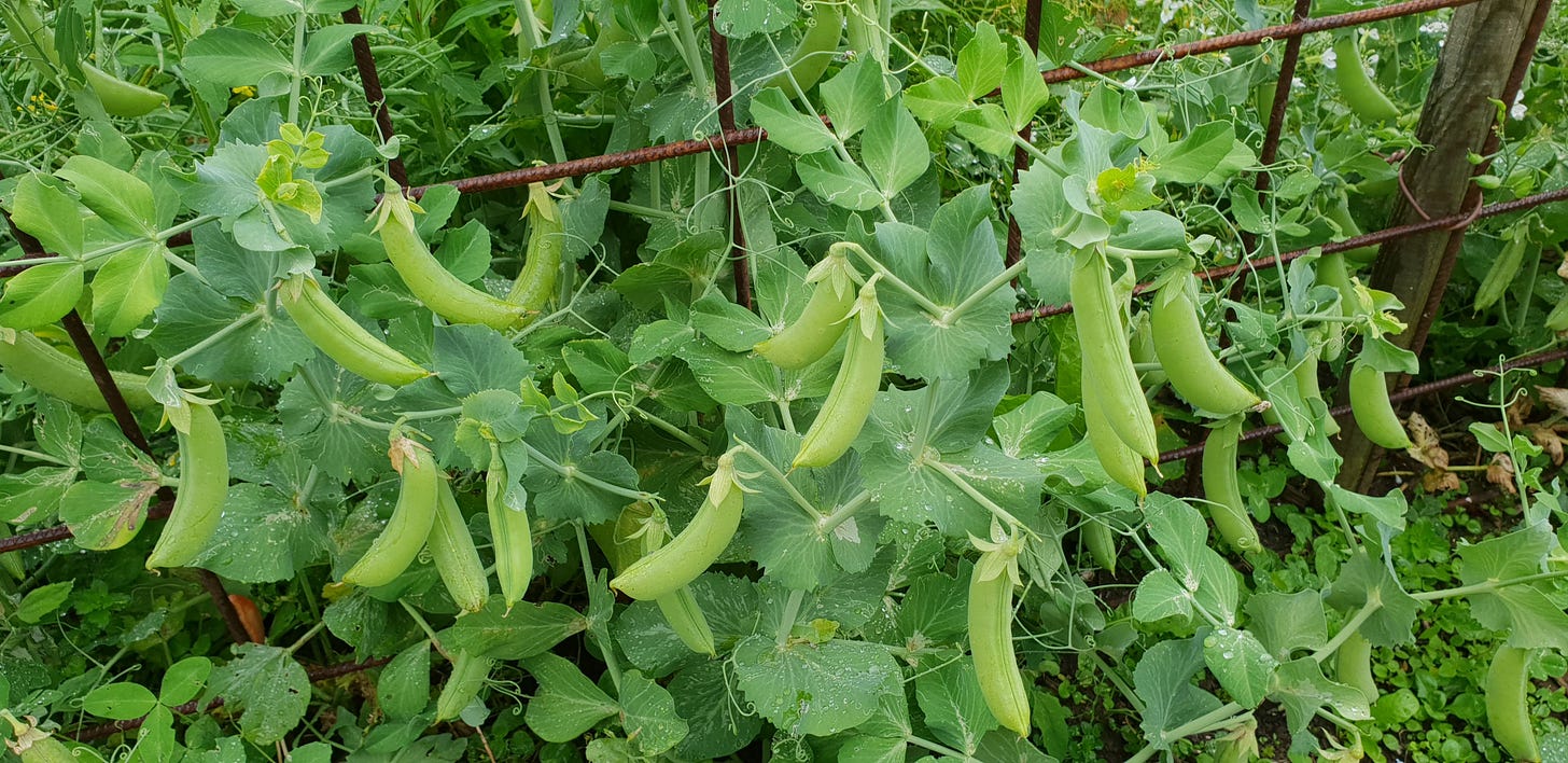 There is nothing quite like munching on peas fresh from the garden. They’re one of my favorite vegetables, peas (Pisum sativum). As a kid, my father grew shelling peas on an acre for a local canning company. I remember shelling our own for the freezer, while sitting on the rickety back porch with my mother. The pea field was just on the other side of the white plank fence near us. Apparently, it wasn’t very profitable, because the only peas we grew after that were in our garden. Commercial production of peas involves combine harvesting, which today is preceded by “dessication”, i.e. the use of herbicides to reduce water levels. Combining is also more complex for peas, because it requires crop lifters to raise the vines so that the pea pods can be harvested. Dwarf varieties that ripen pods all at once are used for mechanized harvesting.